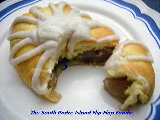 While cooling, mix up an icing/glaze consisting of about 2-3 Tbsp heavy cream, 1/2 tablespoon vanilla bean paste, a dash of cinnamon, and 1/2 to 3/4 cup confectioner's sugar until thick and smooth. Load into a zipper sandwich bag and snip the end...drizzle all over the dumpling-like dessert. It was so freaking delicious! E-Z P-Z!!!